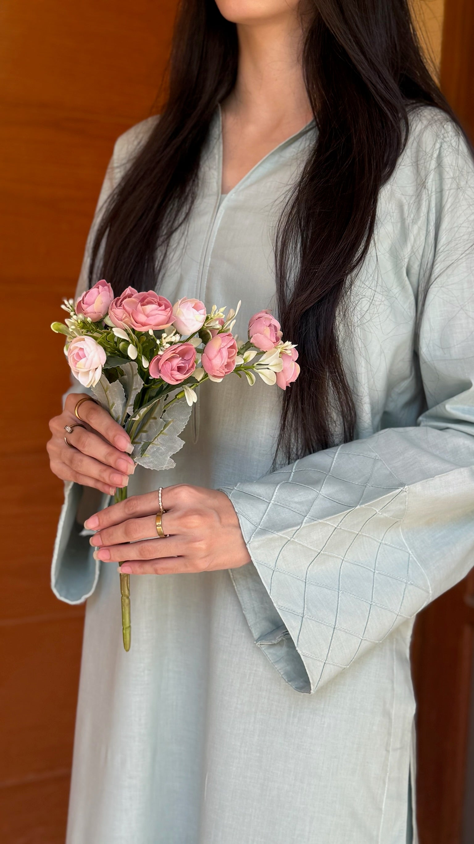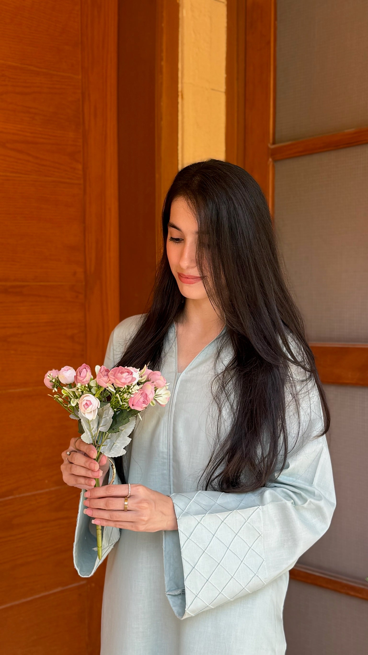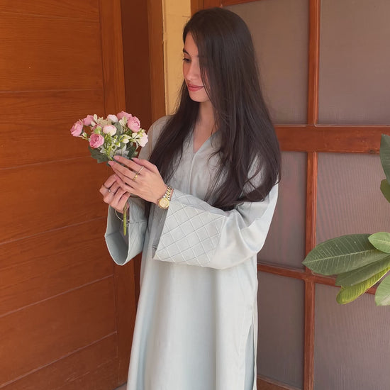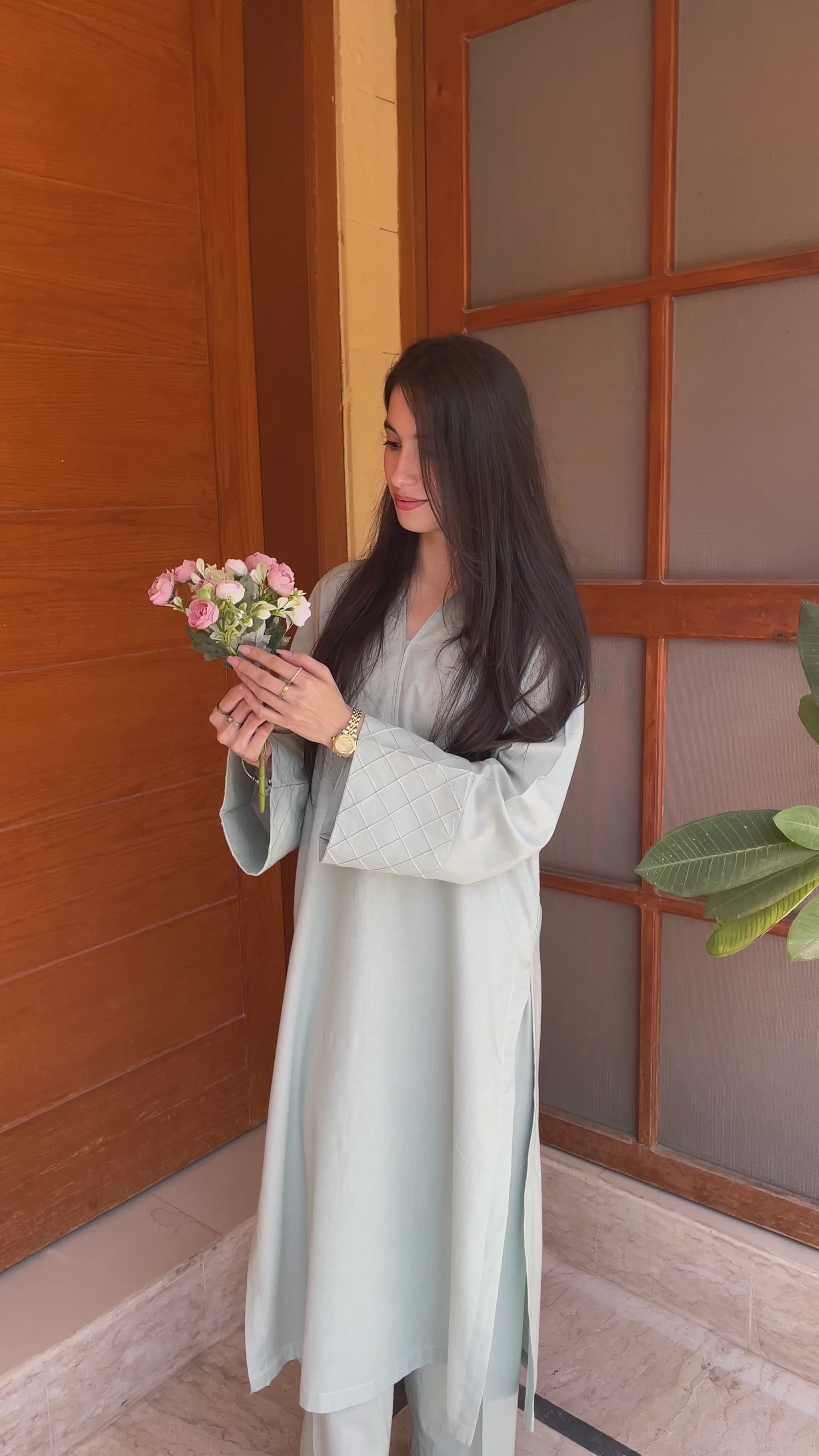 A refreshing mint green two-piece set featuring a sleek neckline and statement flared sleeves with pin-tuck detailing, creating a refined, structured design. Paired with matching straight trousers for a chic, minimalist outfit.